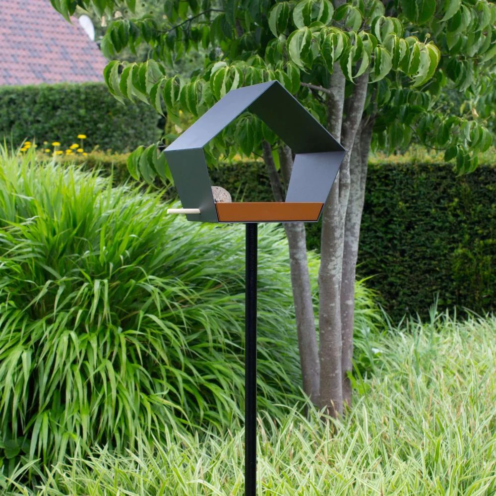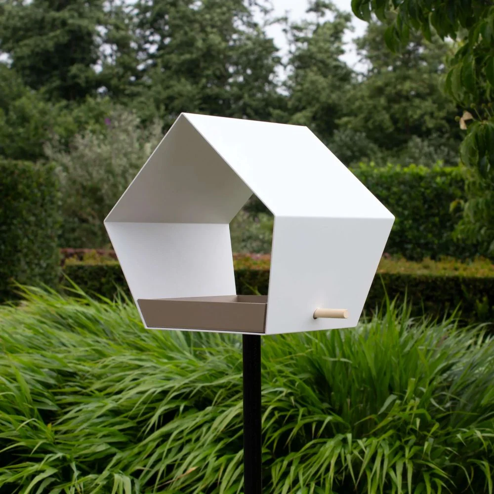 Wat dit voederhuisje onderscheidt, is het verwijderbare metalen schaaltje, perfect geïntegreerd in het ontwerp. Het wordt op zijn plek gehouden door een beukenhouten stokje dat niet alleen functioneel is, maar ook dient als zitstokje voor vogels. Dankzij deze slimme constructie is het schaaltje eenvoudig te reinigen – hygiënisch, snel en zonder gedoe.