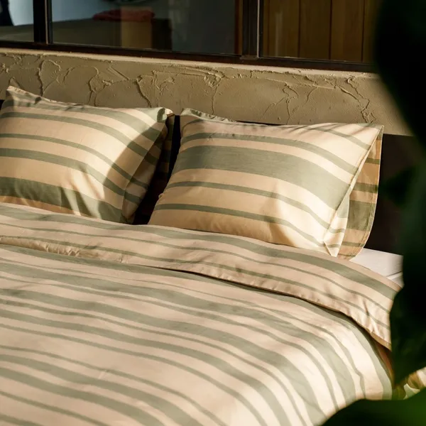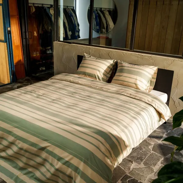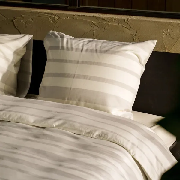 Sora is een strak en modern dekbedovertrek. Horizontale lijnen in verschillende diktes wisselen elkaar af. Sora is yarn dyed. Dit betekent dat de garens in specifieke kleuren worden geverfd voordat ze in een ontwerp worden geweven. Het ontwerp maakt dus letterlijk deel uit van de stof.